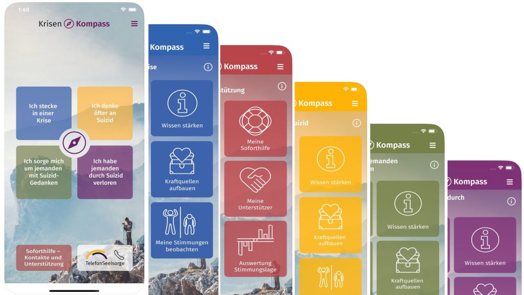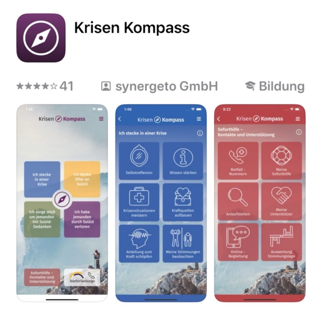 Mit der App Krisen Kompass® bietet die TelefonSeelsorge in Deutschland Kindern, Jugendlichen und Erwachsenen ein Instrument zur Krisenbewältigung. Die App bietet Hilfe zur Selbsthilfe. Genauso bietet sie Unterstützung für Angehörige, Freundinnen und Freunde und für Hinterbliebene in Suizidfällen.